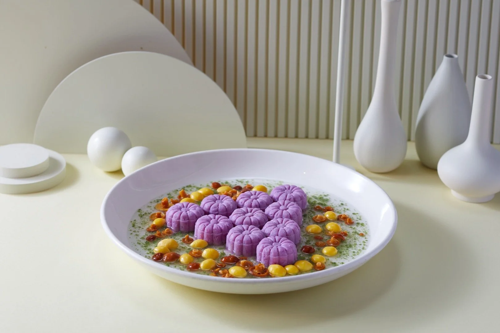 採用新鮮的紫色山藥,蒸熟打泥再純手工塑型,內有放入脆口洋地瓜,不加任何的添加物,搭配菠菜汁做的翡翠與珍珠滑菇, 讓視覺更有食慾,吃起來健康軟糯。